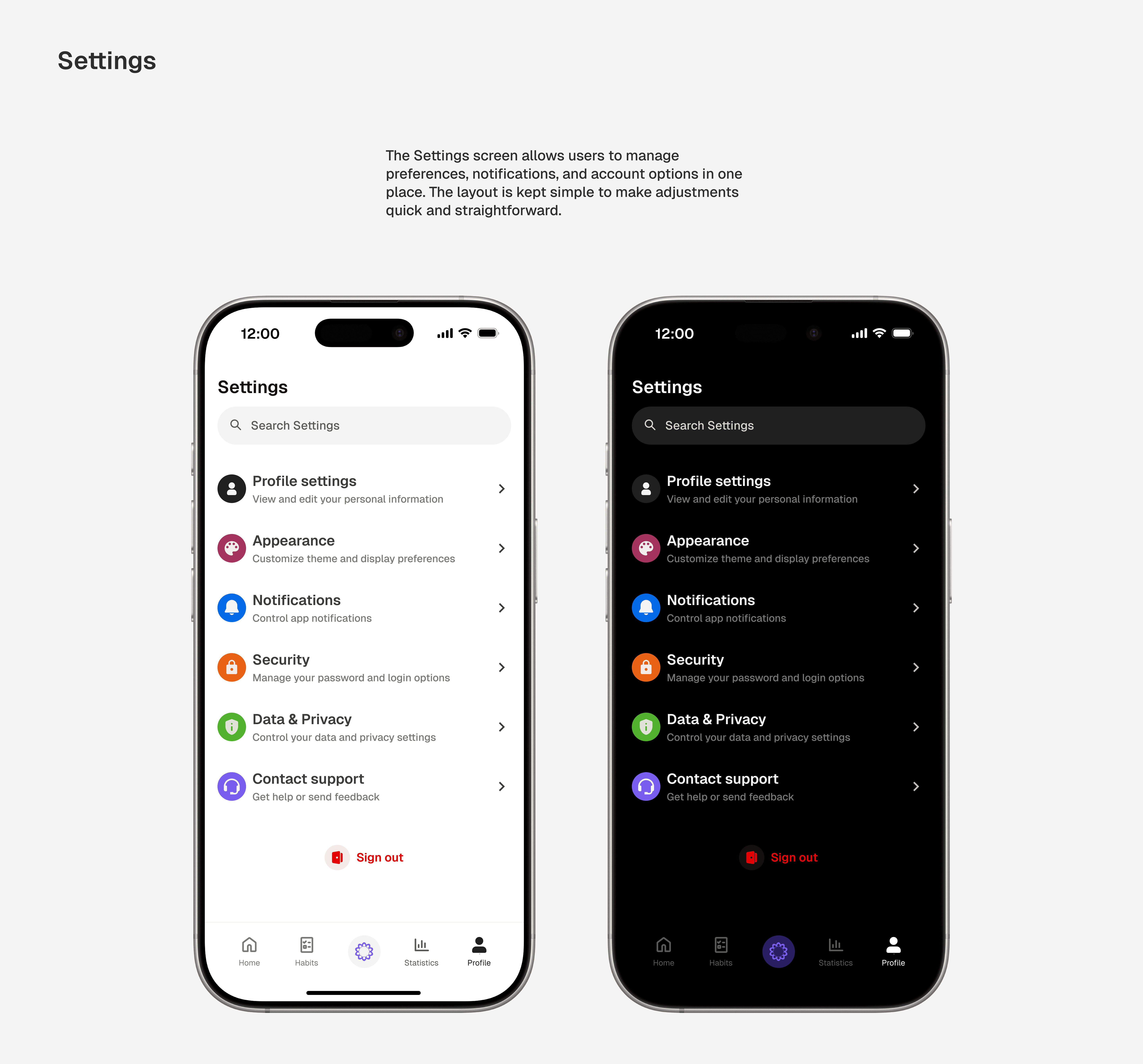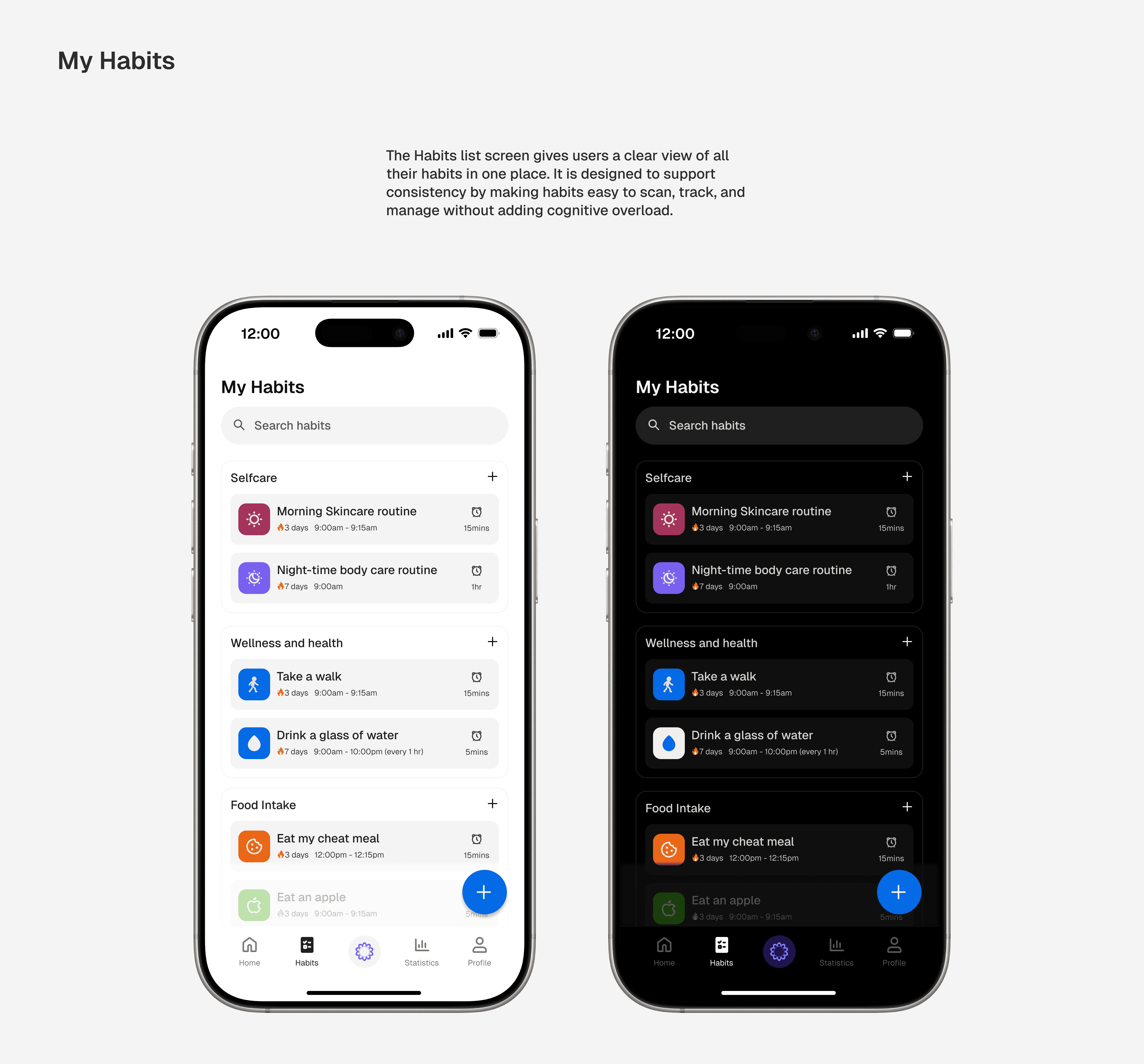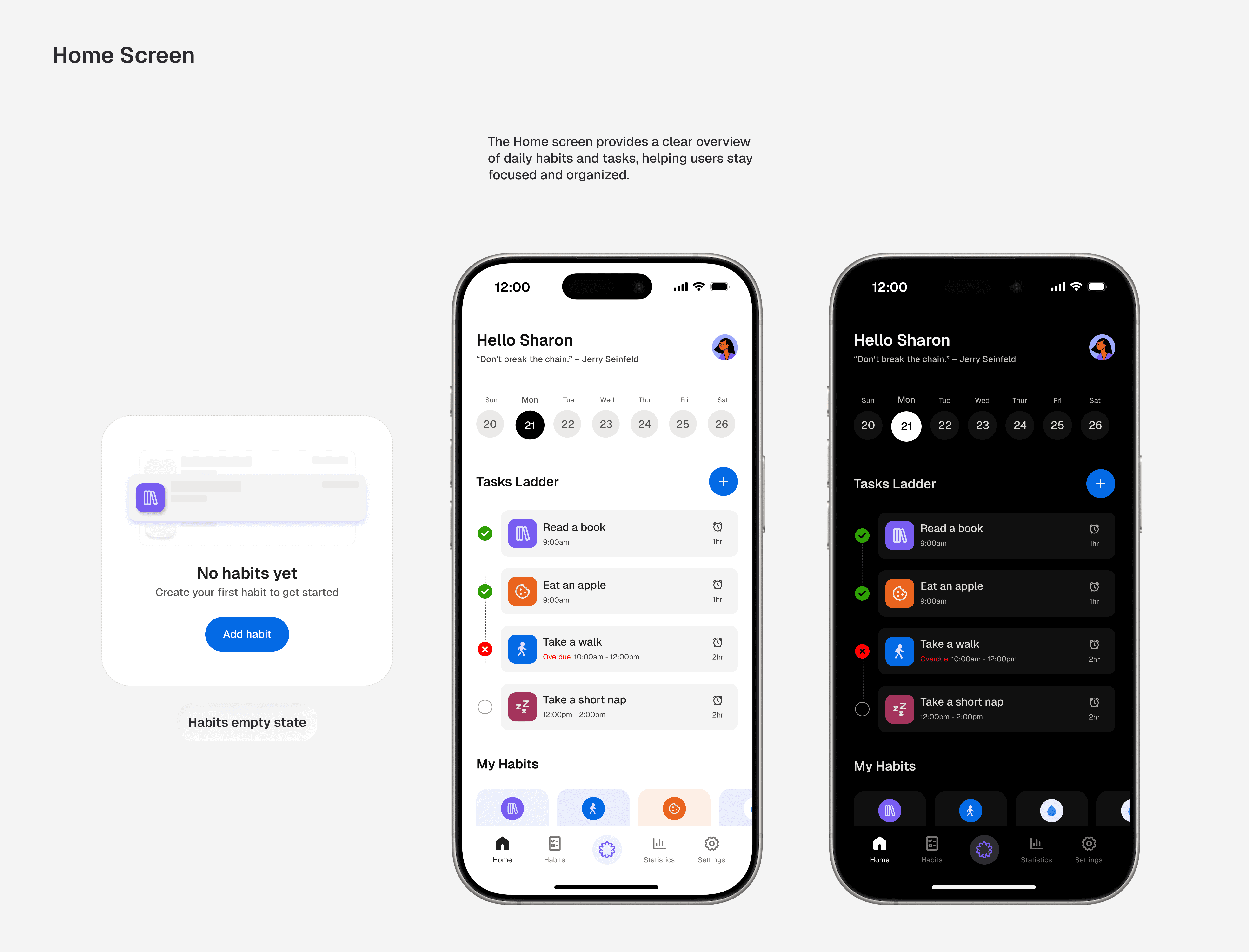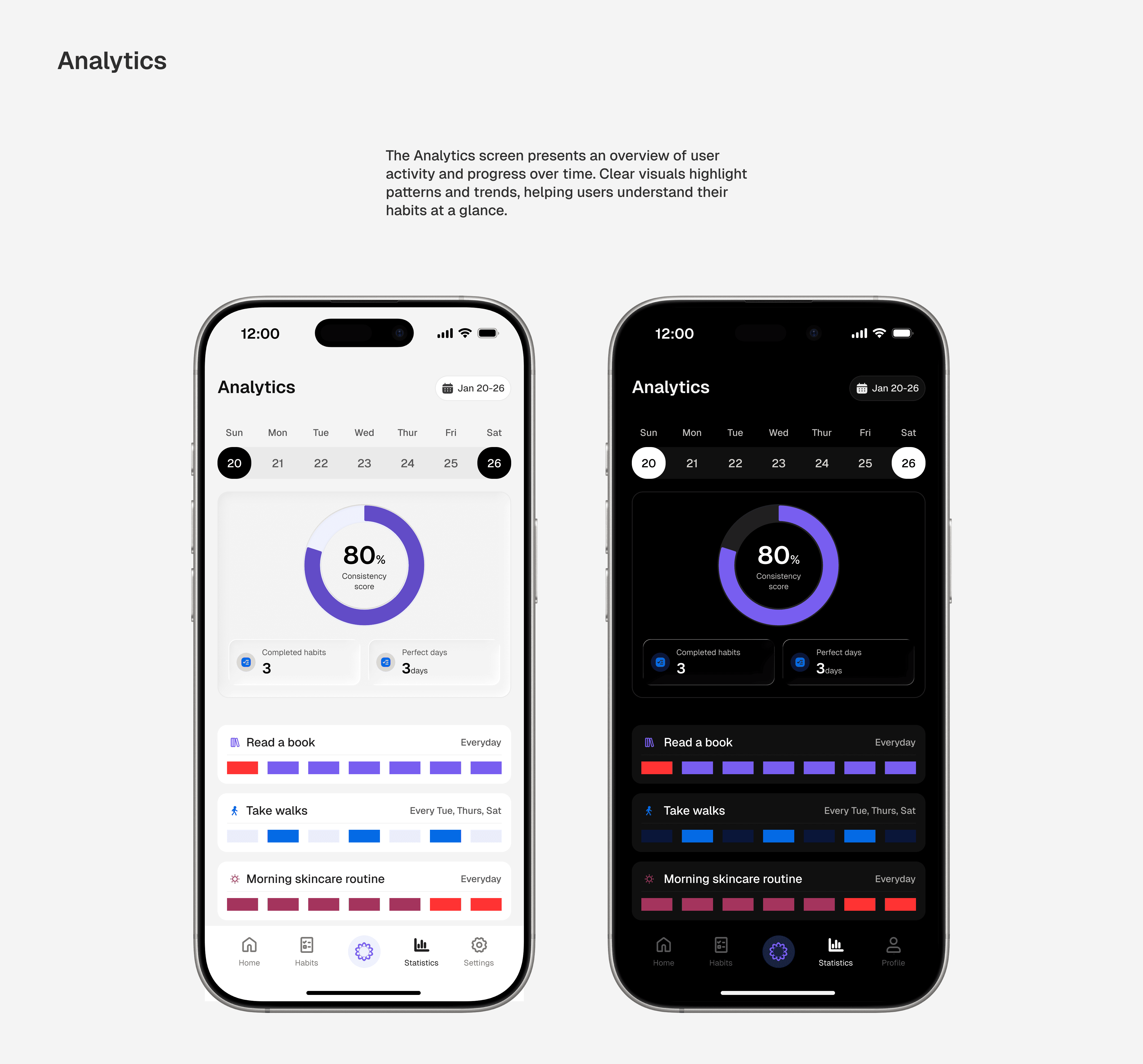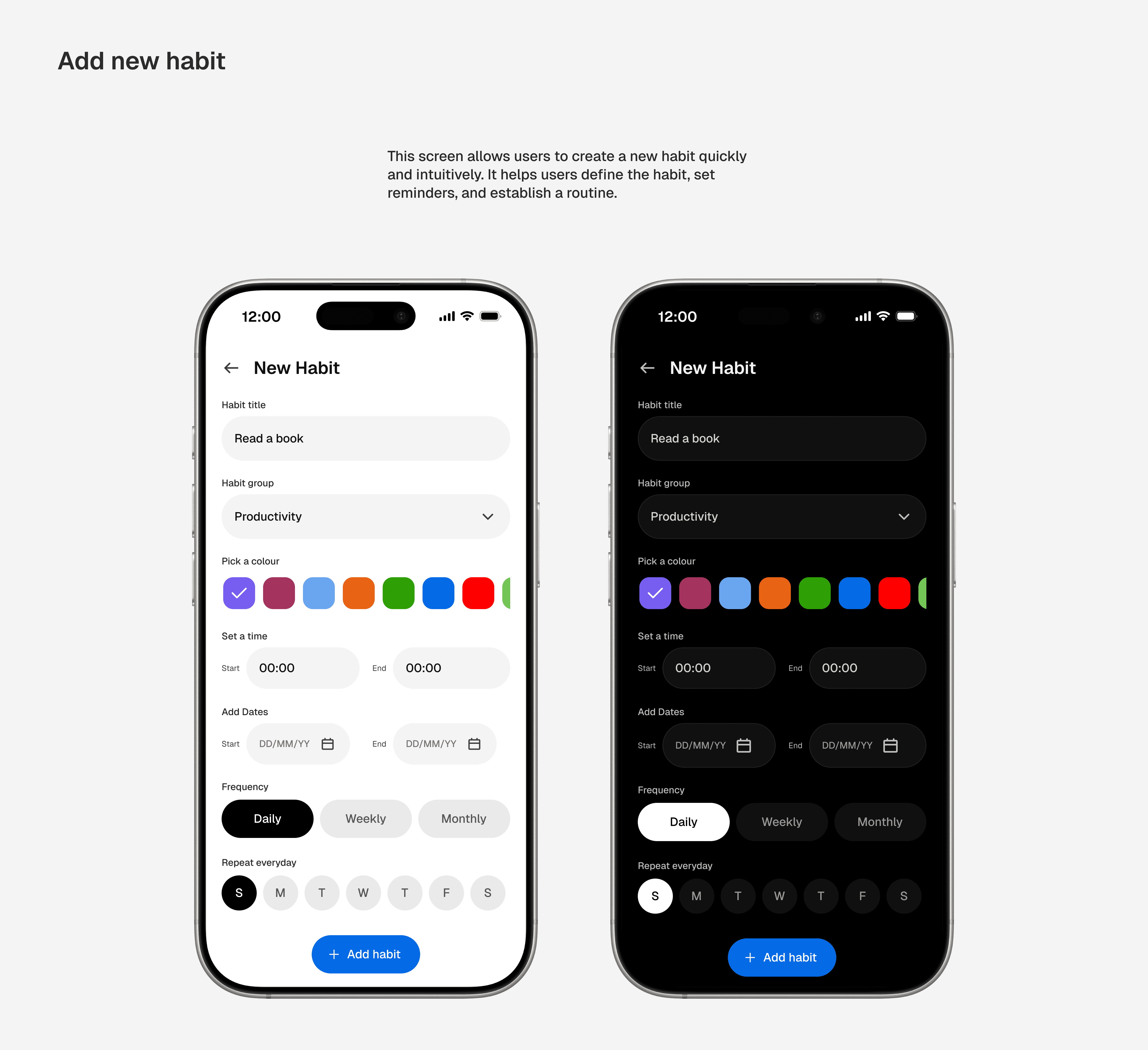 With the structure in place, the focus shifted to high-fidelity design. The interface was designed with both light and dark modes to adapt seamlessly across devices, using a minimal visual language to support calm, focused daily planning and habit tracking.